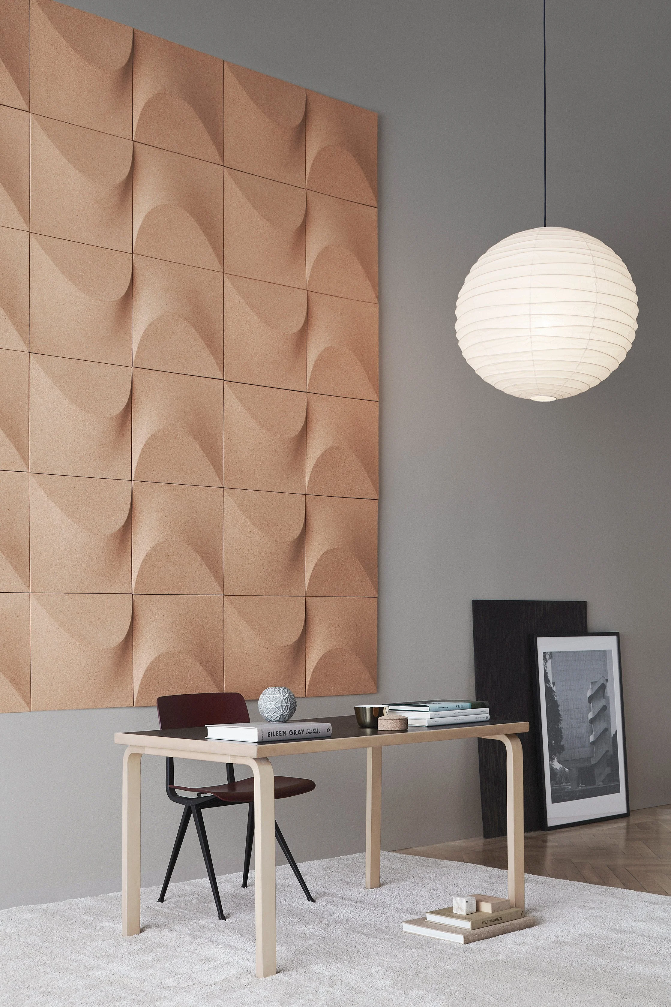 Created for the Swedish brand Abstracta, this acoustic product is made of cork, a natural material that offers excellent sound diffusion properties. Its form evokes sand formations carved by the wind, and one can create a multitude of patterns by rotating the panels.