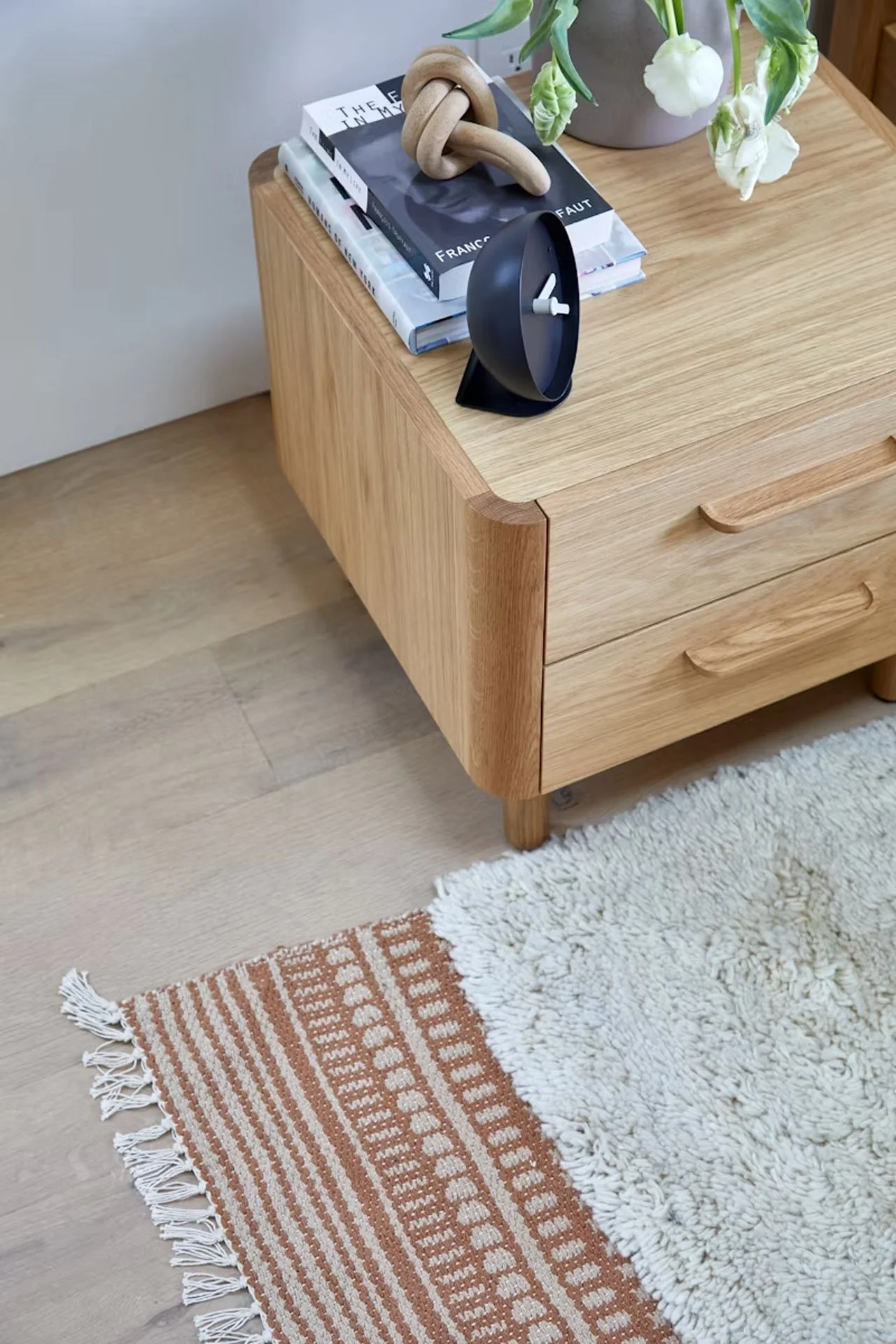 This collection consists of a platform bed with a soft, upholstered headboard, a dresser, tall boy and a bedside storage unit. The key idea was to use solid wood to express a sense of softness in the bedroom, with the rounded edges of the bed platform and storage units, turned wooden legs and sculpted drawer handles co-existing harmoniously.